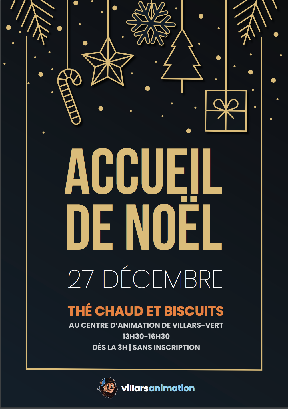Accueil de Noël Thé chaud et biscuits Centre d'animation de Villars-Vert 13h30-16h30 dès la 3H / sans inscription 0catégorie: Vacances